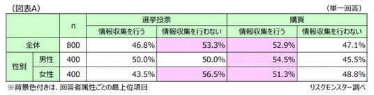 また、選挙投票時と購買時を比較すると、全体および男女別のすべてのセグメントで、購買時の方が「情報収集を行う」割合が高いことから、多くの人にとっては、「選挙投票」よりも「10万円程度の買い物」の方が、心理的な慎重度が強く表れている様子がうかがえます。(図表A)