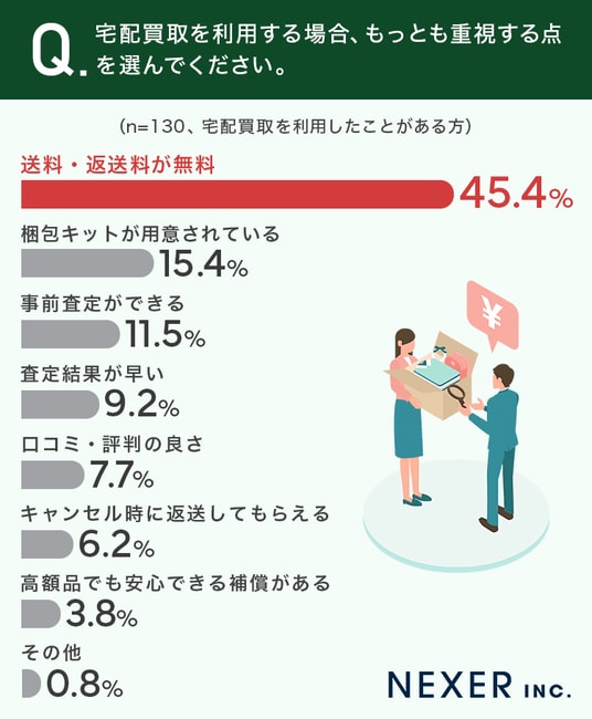 ■45.4%が、宅配買取で「送料・返送料が無料」をもっとも重視すると回答