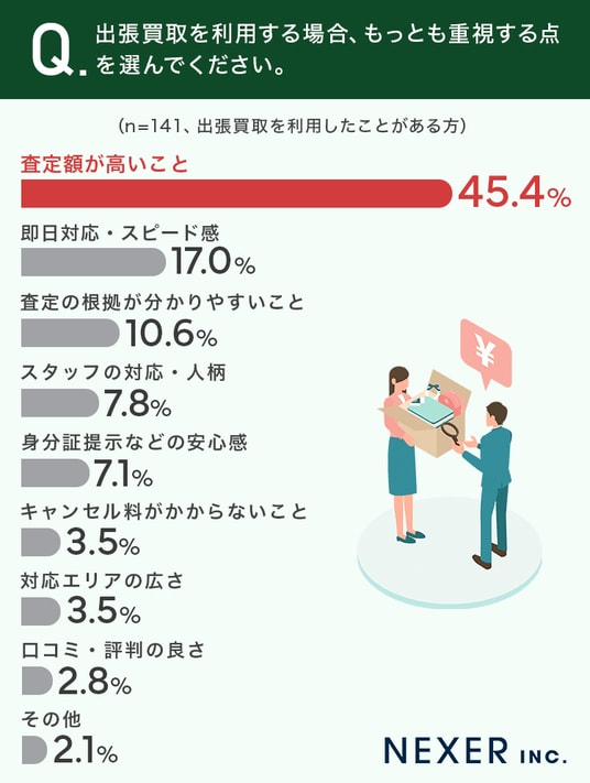 ■45.4%が、出張買取で「査定額が高いこと」をもっとも重視すると回答