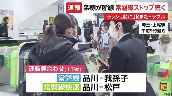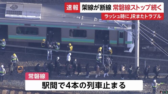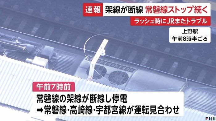 JR東日本によると、午前7時前、上野駅で常磐線の架線が断線し停電が発生したため、常磐線や高崎線、宇都宮線が運転を見合わせた。