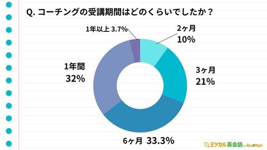 「コーチングの受講期間はどのくらいでしたか?」と質問したところ、最多は「6ヶ月(33.3%)」で、僅か1.3ポイント差で「1年間(32.0%)」との回答が続く結果となりました。