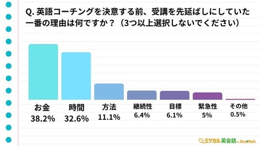 「英語コーチングを決意する前、受講を先延ばしにしていた一番の理由は何ですか?(3つ以上選択しないでください)」と質問したところ、最も多い回答が「お金(38.2%)」、次いで5.6ポイント差で「時間(32.6%)」という結果でした。