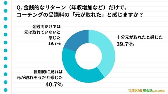 「金銭的なリターン(年収増加など)だけで、コーチングの受講料の『元が取れた』と感じますか?」と質問したところ、「長期的に見れば元が取れそうだと感じた(40.7%)」という未来を見据えた前向きな回答が最多でした。