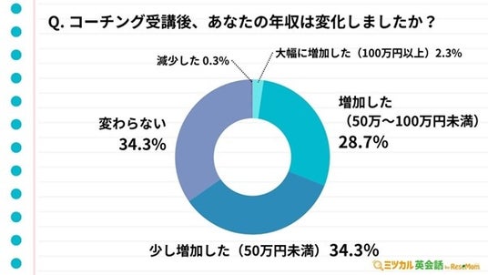 「コーチング受講後、あなたの年収は変化しましたか?」と質問したところ、「少し増加した(50万円未満)(34.3%)」と「変わらない(34.3%)」が同率で最多の回答数という結果でした。