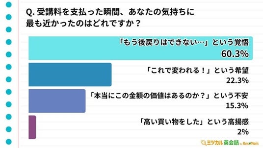 「受講料を支払った瞬間、あなたの気持ちに最も近かったのはどれですか?」と質問したところ、最も多く寄せられた回答は「『もう後戻りはできない…』という覚悟(60.3%)」でした。