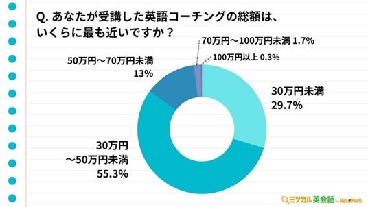「あなたが受講した英語コーチングの総額は、いくらに最も近いですか?」との質問に対し、「30万円~50万円未満(55.3%)」が半数以上を占めています。