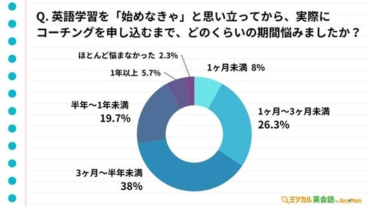 「英語学習を「始めなきゃ」と思い立ってから、実際にコーチングを申し込むまで、どのくらいの期間悩みましたか?」と質問したところ、最も多い回答は「3ヶ月~半年未満(38.0%)」でした。