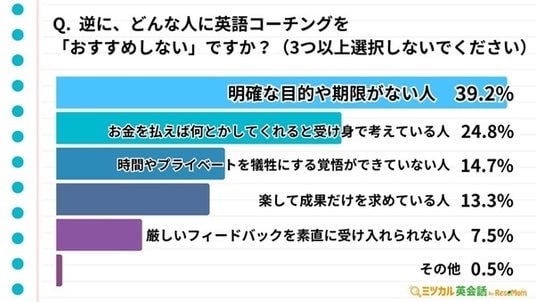 「逆に、どんな人に英語コーチングを「おすすめしない」ですか?(3つ以上選択しないでください)」と質問したところ、「『いつか話せたらカッコいい』など、明確な目的や期限がない人(39.2%)」という回答が最多でした。