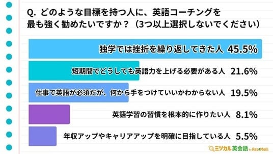 【「独学で挫折した人」にオススメ45.5%】短期間の成果アップやビジネス英語にコーチング推奨の声