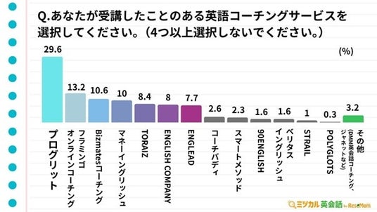 「あなたが受講したことのある英語コーチングサービスを選択してください。(4つ以上選択しないでください。)」と質問しました。その結果、最も利用されている英語コーチングサービスは「プログリット(29.6%)」であることが判明しました。