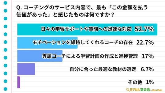 「コーチングのサービス内容で、最も『この金額を払う価値があった』と感じたものは何ですか?」と質問したところ、「日々の学習サポートや質問への迅速な対応(52.7%)」が最多の回答結果でした。