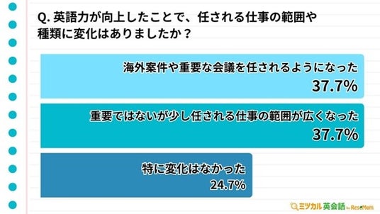 「英語力が向上したことで、任される仕事の範囲や種類に変化はありましたか?」と質問したところ、最多回答は「海外案件や重要な会議を任されるようになった(37.7%)」と「重要ではないが少し任される仕事の範囲が広くなった(37.7%)」が同率でした。