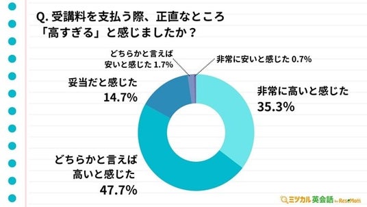 「受講料を支払う際、正直なところ『高すぎる』と感じましたか?」と質問したところ、「どちらかと言えば高いと感じた(47.7%)」と「非常に高いと感じた(35.3%)」を合計して83.0%と、およそ8割を超える受講者が「高い」と感じていたことが判明しました。