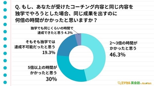 「もし、あなたが受けたコーチング内容と同じ内容を独学でやろうとした場合、同じ成果を出すのに何倍の時間がかかったと思いますか?」と質問したところ、「2~3倍の時間がかかったと思う(46.3%)」と答えた方が最多でした。