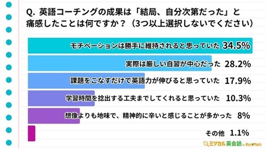 「英語コーチングの成果は『結局、自分次第だった』と痛感したことは何ですか?(3つ以上選択しないでください)」と質問したところ、最も多い回答は「コーチがいれば、モチベーションは勝手に維持されると思っていた(34.5%)」でした。