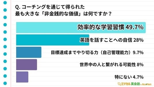 「コーチングを通じて得られた最も大きな『非金銭的な価値』は何ですか?」と質問したところ、「効率的な学習習慣(49.7%)」が最多となりました。
