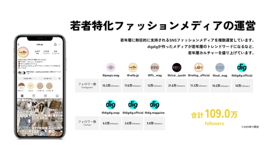 digdigは、Z世代・α世代に熱狂的に支持されるファッション特化SNSメディアを複数展開し、総フォロワー数は100万人を突破しています。
