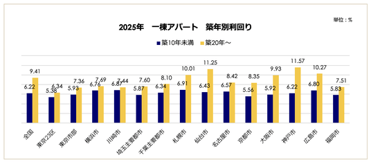 築年数による利回りの変化を見ると、エリアによる資産価値維持力の差が顕著です。東京23区では、築10年未満(5.38%)と築20年以降(6.34%)の差が0.96ポイントと1ポイント未満に留まり、築古物件でも高い価格が維持されています。対照的に神戸市ではその差が5.35ポイント(6.22% vs 11.57%)と大きく開いており、築年数の経過と共に利回りが急上昇(価格が下落)する傾向が見られます。
