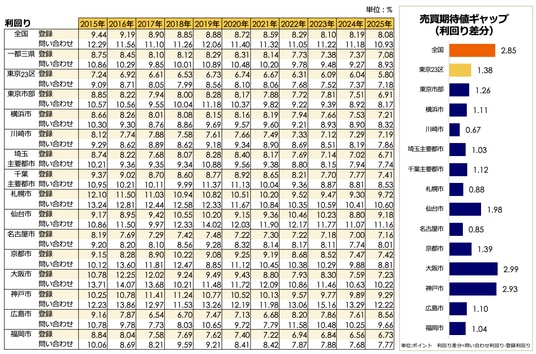地域別の動向を見ると、首都圏の平均価格は9,239万円(前年比+10.91%)、関西圏は7,737万円(同+4.03%)と、都市圏が価格上昇を牽引しています。一方で、北海道、東北、東海などの地方圏では価格が前年から下落または横ばいとなっており、都市圏への一極集中傾向が見られます。利回りに関しては、信州・北陸(13.93%)、東北(12.70%)、北海道(12.38%)など、地方圏では10%を大きく超える高水準が継続しています。