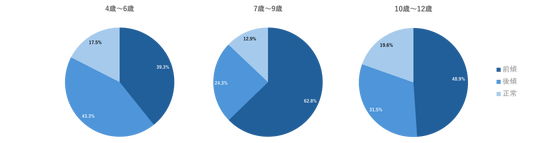 身体の前後バランスに注目すると、いずれの年代でも「真っすぐ」と言える姿勢は2割以下にとどまり、多くの子どもに前後いずれかの傾きが見られました。特に、小学校入学後にあたる7歳以上では、前傾姿勢の割合がやや高くなる傾向が確認されました。