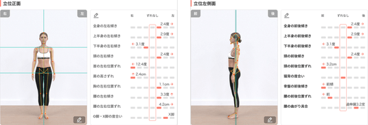 シセイカルテによるAI姿勢分析データを活用し、立位正面、立位左側面の姿勢分析結果を抽出(下図グラフ数値※4)