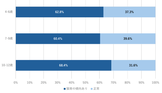 ・10歳~12歳の小学校高学年では約7割に猫背傾向が見られ、学年が上がるにつれて背中の丸まりが強くなることが分かった