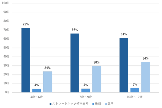 ■入学前の子どもの7割以上は、頭が前に出た「頭部前傾(ストレートネックの姿勢に近い状態)」が見られるが、成長に伴い目立ちにくくなる傾向あり