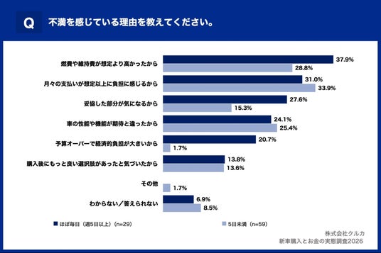 ■不満の理由、ほぼ毎日使用する層は「燃費・維持費」37.9%、週5日未満使用する層は「月々負担」33.9%がトップ