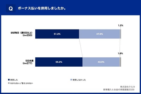 また、ローンを利用した方のボーナス払い併用状況を比較したところ、ほぼ毎日(週5日以上)使用する層では51.2%が「併用した」と回答し、週5日未満使用する層(55.2%)を4.0ポイント下回りました。使用頻度が高いほどボーナス払いを避け、月々の支出を平準化する傾向が見られます。