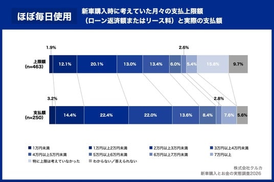 まず、ほぼ毎日(週5日以上)車を使用する層について、「新車購入時に考えていた月々の支払い上限額」と「実際の支払額」を比較しました。上限額では「2万円以上3万円未満」が20.1%で最多となり、実際の支払額でも同じく「2万円以上3万円未満」が22.4%で最多となりました。上限額と実際の支払額の差は2.3ポイントにとどまり、ほぼ毎日使用する層では想定通りの支払いを実現できている傾向がうかがえます。