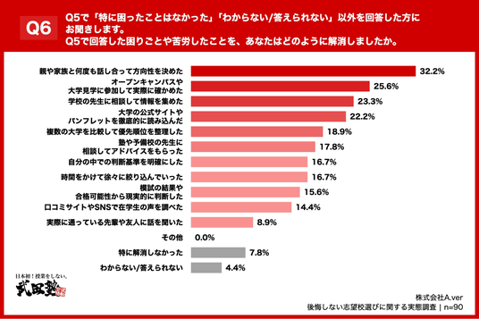 「Q6. Q5で「特に困ったことはなかった」「わからない/答えられない」以外を回答した方にお聞きします。Q5で回答した困りごとや苦労したことを、あなたはどのように解消しましたか。(複数回答)」(n=90)と質問したところ、「親や家族と何度も話し合って方向性を決めた」が32.2%、「オープンキャンパスや大学見学に参加して実際に確かめた」が25.6%、「学校の先生に相談して情報を集めた」が23.3%という回答となりました。