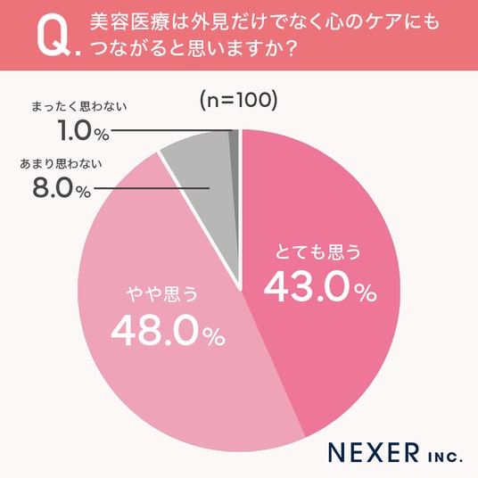 「とても思う」が43%、「やや思う」が48%という結果になり、合わせて91%の方が美容医療は心のケアにもつながると考えていることがわかりました。一方で「あまり思わない」は8%、「まったく思わない」は1%にとどまりました。