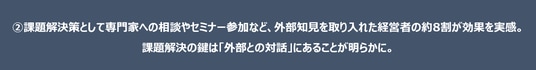 2.課題解決策として専門家への相談やセミナー参加など、外部知見を取り入れた経営者の約8割が効果を実感 。