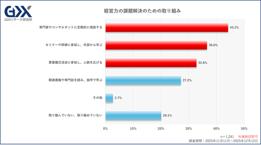 経営力の課題解決のための具体的な取り組みについての設問では「専門家やコンサルタントに定期的に相談する」(44.2%)が最も多く、次いで「セミナーや研修に参加し、外部から学ぶ」(36.6%)、「異業種交流会に参加し、人脈を広げる」(32.8%)という回答が続きました。