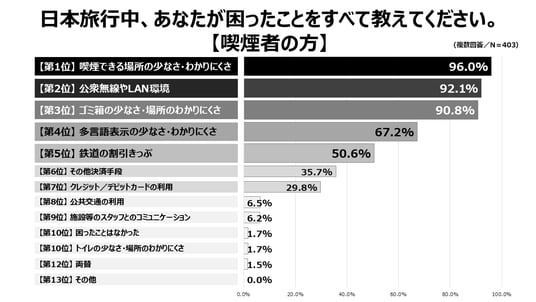 全体では41.1%の項目である「喫煙できる場所の少なさ・場所のわかりにくさ」ですが、喫煙者(N=403)では96.0%で最多となりました。なお、約2年半前の前回調査でも同課題が喫煙者の1位でした。