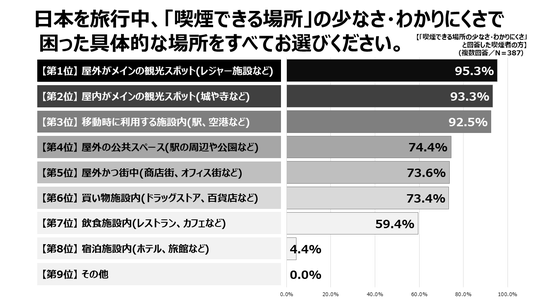 ■喫煙場所で困った場面は「屋外の観光スポット」と「屋内の観光スポット」が9割超え