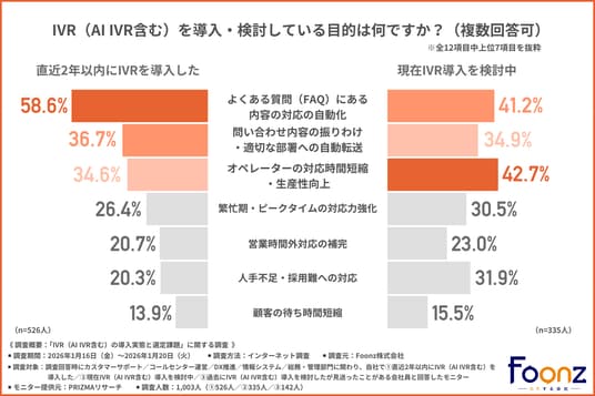 そこで今回、Foonz株式会社(https://foonz.co.jp/)は、カスタマーサポート/コールセンター運営/DX推進/情報システム/総務・管理部門に関わり、自社で1.直近2年以内にIVR(AI IVR含む)を導入した/2.現在IVR(AI IVR含む)導入を検討中/3.過去にIVR(AI IVR含む)導入を検討したが見送ったことがある会社員を対象に、「IVR(AI IVR含む)の導入実態と選定課題」に関する調査を実施しました。