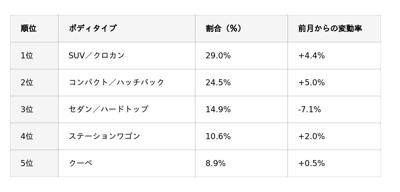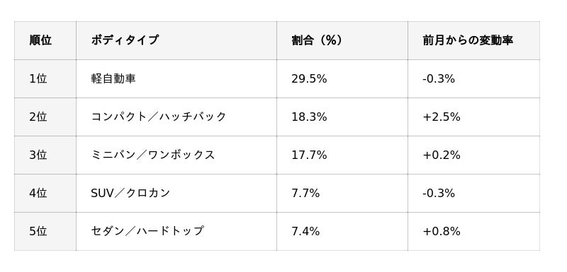国産車ボディタイプ別買取ランキングは、前月2位のミニバン/ワンボックスと、3位のコンパクト/ハッチバックが順位を入れ替えました。