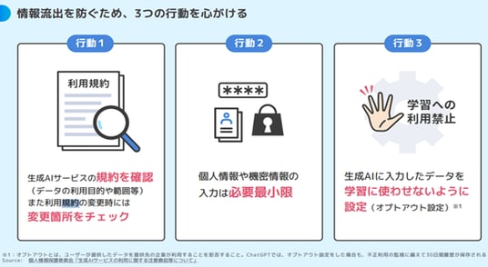 総務省によると、日本において、何らかの生成AIサービスを「使っている(過去使ったことがある)」と回答した人の割合は、全体で26.7%、20代においては44.7%となっています。(※1)生成AIの活用が広がる中、総務省は、情報流出を防ぐための行動として「規約」を確認し、規約の変更時には変更箇所をチェックすることを推奨しています。(※2)