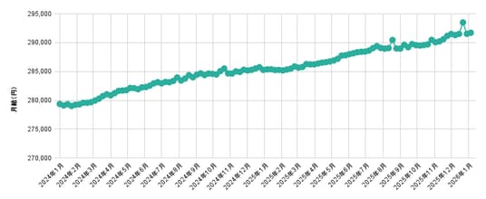 ■1月度の全国正社員平均月給は、291,704円(前月比+214円、前年同月比+6,344円)で前月から0.07%増加、前年同月から2.22%増加した。【図1】