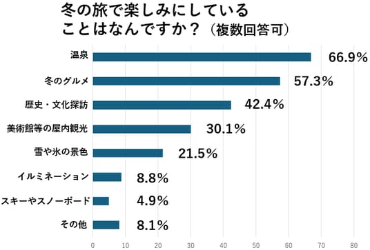 「冬の旅で楽しみにしていること」についても聞いたところ、66.9%の人が「温泉」と回答。次いで「冬のグルメ」が57.3%。「歴史や文化」について冬旅で巡る、といった人も42.4%いらっしゃいました。(n=590)