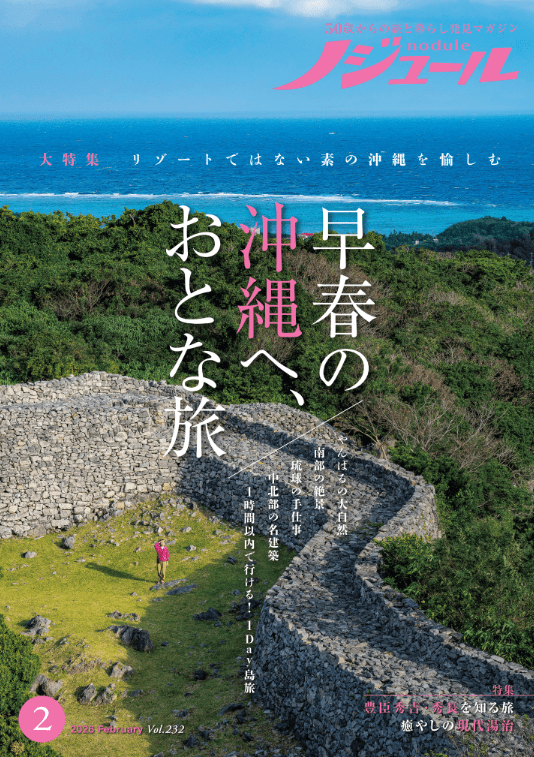 『ノジュール』では、おすすめの旅プランや、旅を快適に過ごすヒントなどの情報を提供し、ひとり旅を応援し続けています。2月号では、「早春の沖縄へ、おとな旅」を特集しています。オフシーズンの沖縄こそおとなが楽しめる魅力がいっぱい。悠久の歴史を感じさせる絶景や、やちむん・紅型などの手仕事、満天の星が降りそそぐやんばるの森などをご紹介します。リゾートではない沖縄で、おとな旅を楽しんでみませんか。『ノジュール2月号』は、2026年1月末発行。年間定期購読受付中です。
