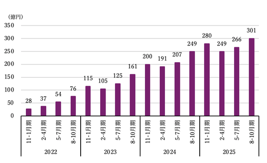 ・2025年4Q(2025年8-10月期)の総賃金額(実績)は301億円(前年同期比+20.7%)