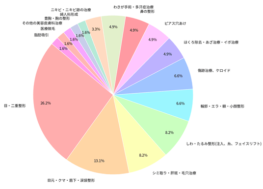 年明けのスタートとともに、自分磨きや休暇明けのメンテナンスとして「目元」や「美肌治療」に関する相談が多く寄せられました。1位:目・二重整形:26.2%