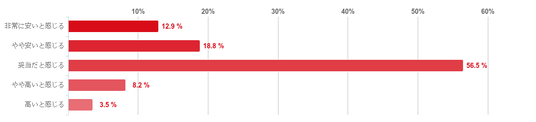 「妥当だと感じる」と回答した人が56.5%と回答者の半数を占め最も多く、次に「やや安いと感じる」との回答が18.8%となり、「非常に安いと感じる」(12.9%)と回答した人を合わせると9割近い人がクリニックフォアのAGA治療の料金設定に納得していることがわかった。なお、「高いと感じる」と回答した人は僅かだった。