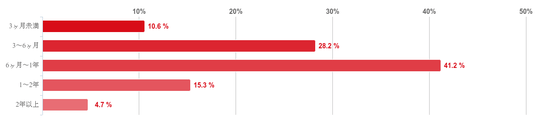 「6か月~1年」と回答した人が41.2%で最も多く、次に「3~6か月」との回答が28.2%、「1~2年」が15.3%という順となった。そのほか、「3か月未満」と回答した人は6.7%で、「2年以上」が4.7%となり、回答者の多くの治療期間が「3か月~2年未満」ということがわかった。