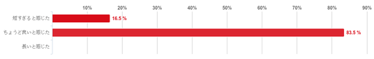 「ちょうど良いと感じた」との回答が83.5%で圧倒的に多く、「短すぎると感じた」(16.5%)との回答数を大きく上回った。反対に、「長いと感じた」と回答した人はいなかった。