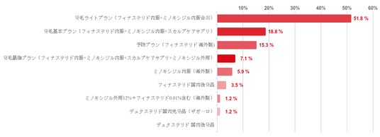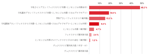 「発毛ライトプラン(フィナステリド内服+ミノキシジル内服合剤)」と回答した人が48.2%で最も多く、次いで「発毛基本プラン(フィナステリド内服+ミノキシジル内服+スカルプケアサプリ)」との回答が18.8%、「予防プラン(フィナステリド 海外製)」が15.3%、「発毛最強プラン(フィナステリド内服+ミノキシジル内服+スカルプケアサプリ+ミノキシジル外用)」が9.4%と共に1割程度で続いた。