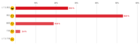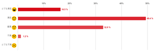 「満足」と回答した人が49.4%となり、約5割で最も多く、「とても満足」との回答と合わせると約7割の人が満足していることがわかった。反対に、「不満」と回答した人は1.2%と僅かで「とても不満」と回答した人はいなかった。