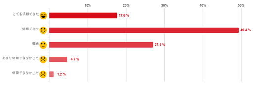 「信頼できた」と回答した人が49.4%で約半数となり最も多く、「とても信頼できた」(17.6%)との回答と合わせると7割近くの人が医師の説明や対応について「信頼できた」と感じていることがわかった。反対に、「あまり信頼できなかった」と回答した人は4.7%と少数となり、「信頼できなかった」と回答した人は僅かだった。